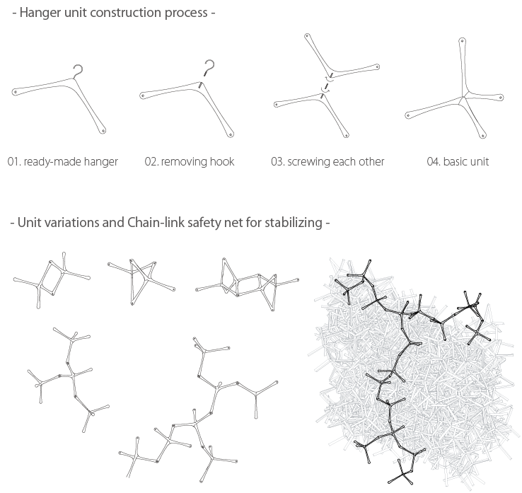 By controlling the volume of the hanger aggregate, it will appear not only as a partition wall or a display device itself, but also as a part of furniture in the shop. Recyclescape is the ultimate commercial structure in the 21st century, generated with minimum materials and less waste, to optimize the possibility of the total commercial scape.